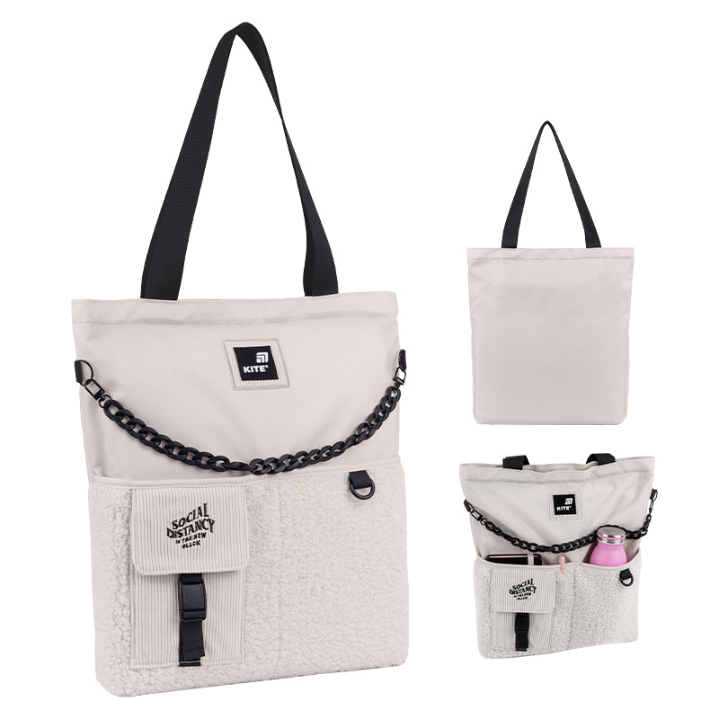 - Dekor: aplikacja wykonana z połączonych materiałów, metalowy ozdobny łańcuszek, ozdobny brelok z metalowym karabińczykiem.